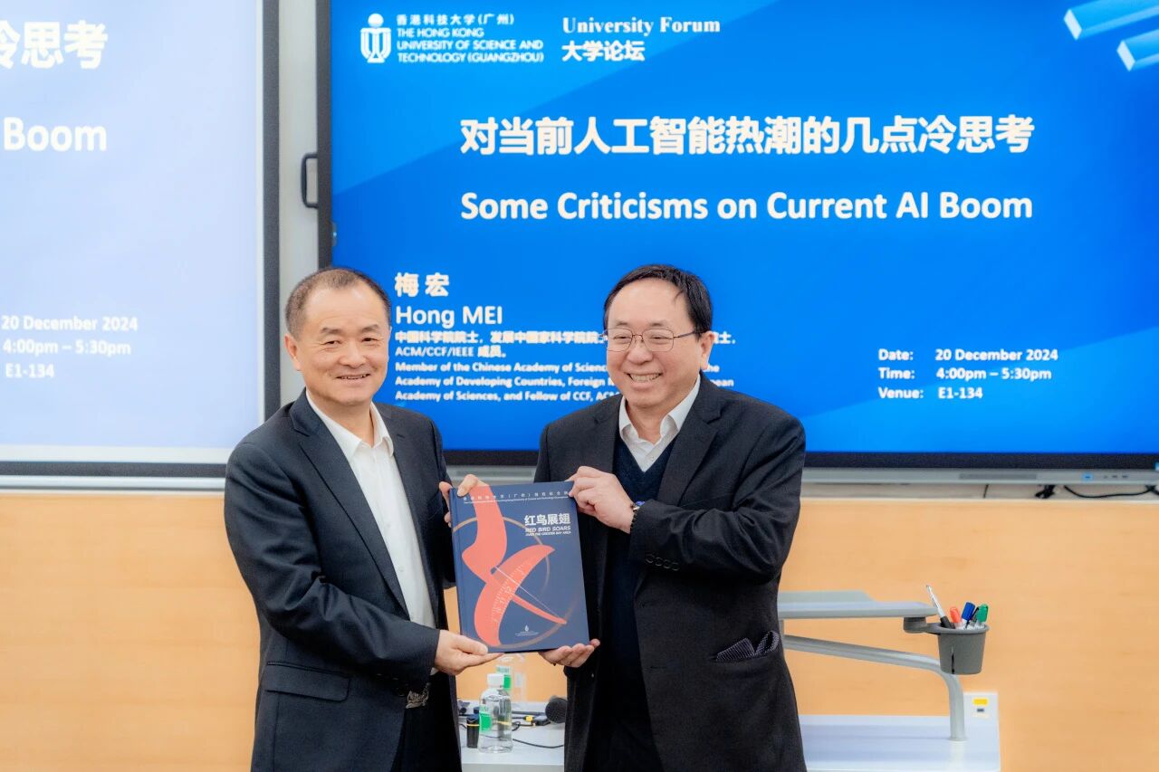 12月20日,香港科技大学(广州)迎来第十期“大学论坛”。本次论坛特邀请中国科学院院士、高可信软件技术教育部重点实验室(PKU)主任,中国计算机学会(CCF)第十二届理事长及CCF中国数字经济50人论坛主任委员梅宏院士作为主讲嘉宾,以其独到视角深入理性地剖析和反思了人工智能本质及发展现状,为全校师生带来了“对当前人工智能热潮的几点冷思考”